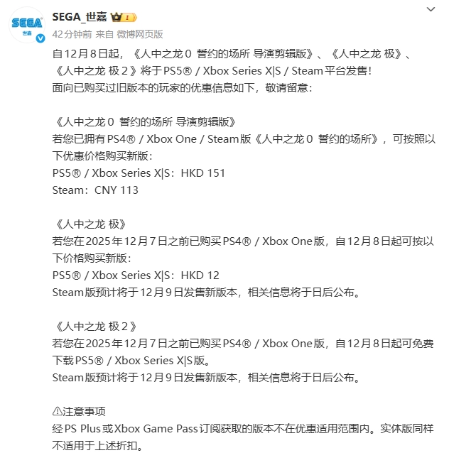 自太平洋时间12月8日上午8:30开始,新玩家将不能再购买上述平台上的《如龙0》原版游戏。
