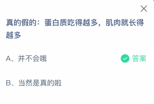 蛋白质吃得越多,肌肉就长得越多,这是真的还是假的?这可是7月10日支付宝蚂蚁庄园小鸡答题的题目呢。支付宝小鸡答题深受大家喜爱,通过参与活动获取饲料,就能喂养小鸡,进而领取更多鸡蛋去帮助更多人。今日这道题的正确答案是【并不会哦】,要知道,多吃蛋白质只是肌肉生长的必要条件,并非唯一要素。