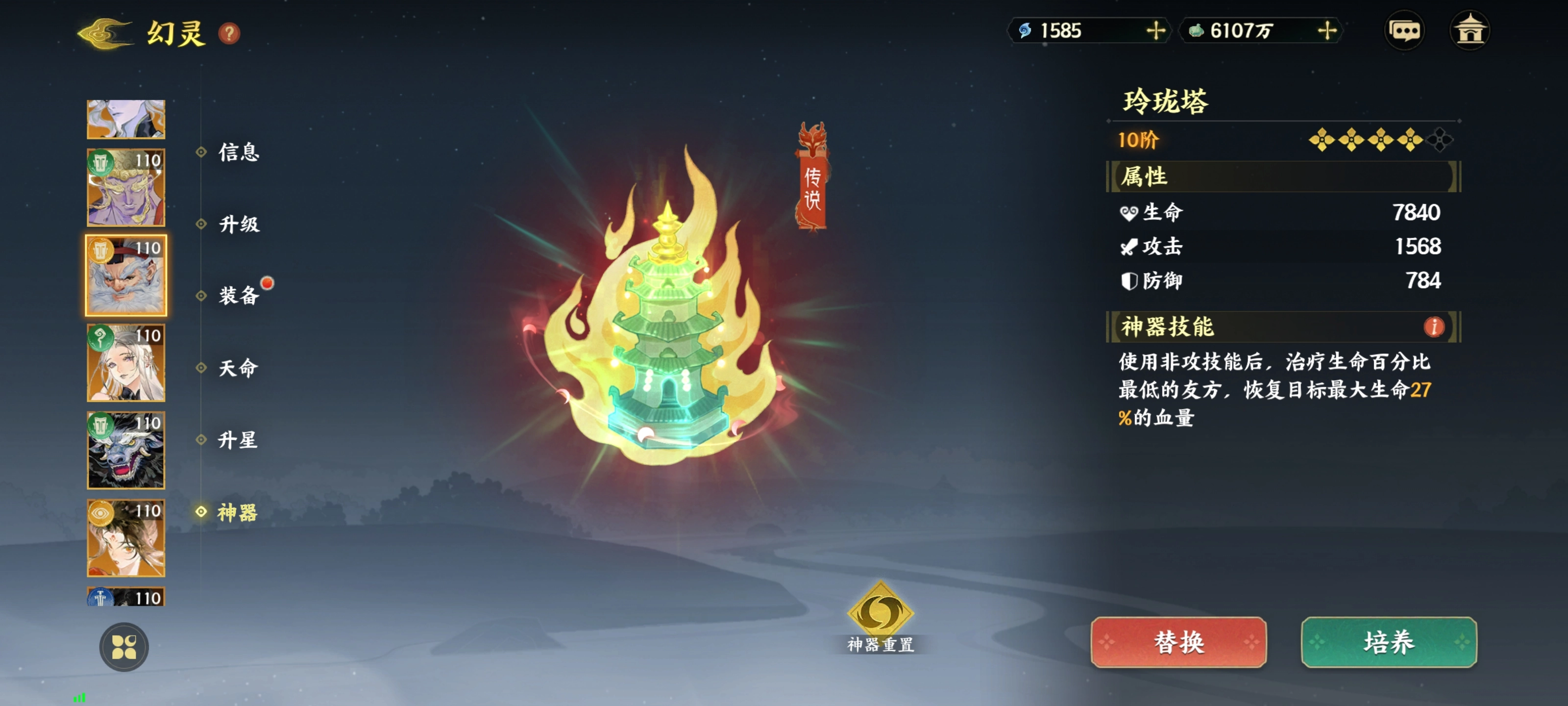 三个奶妈的装备推荐都是三生命套,主词条全部生生生,副词条速度>效果抵抗>生命,如果对面控制多可以带生命➕抵抗套 神器推荐带广寒琼玉 玲珑塔