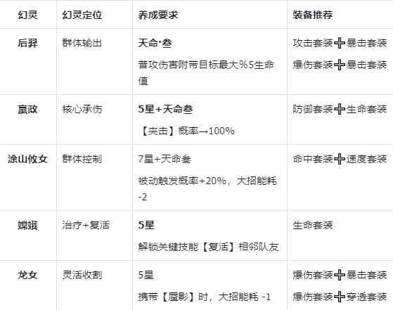 5. 龙女(后排):身为单体输出幻灵,5星时携带【蜃影】,其大招【九渊】的能耗可减少1。将龙女放置在后排,能优先收割残血。