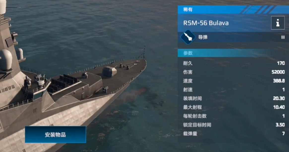 潜射二连发锁定弹,其单发伤害极为夸张,还拥有一定的AOE能力。值得一提的是,这款导弹在游戏中的突防能力十分出色,在5km以上的距离基本能够实现完全突防。