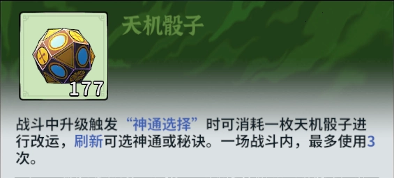 要是碰到咱们不想要的神通或者通用技能,还能选择投掷一次天机骰子来更换。天机骰子是消耗品道具,每次升级挑选技能时,仅能投掷一次。可别小瞧这一次重新选择的机会,它能让我们的体系更易成型。