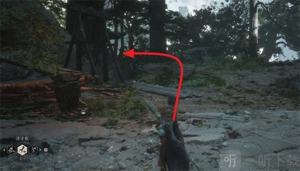 抵达树的附近后,参照下图,树的右侧有一所房子,在房子与后方石头之间有一条楼梯,顺着楼梯向上走。