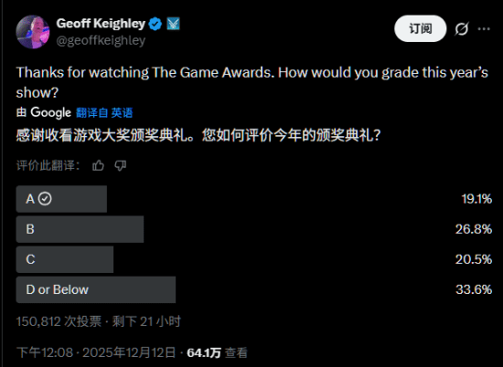 TGA创始人Geoff Keighley在颁奖典礼落幕后,通过发文向玩家征集对本次活动的评价。截至当前,参与投票的人数已突破15万,其中选择“D级及以下”评价的玩家占比最高,达到33.6%;相比之下,给出最高评级“A”的玩家仅占19%,在所有四个选项里占比最低。