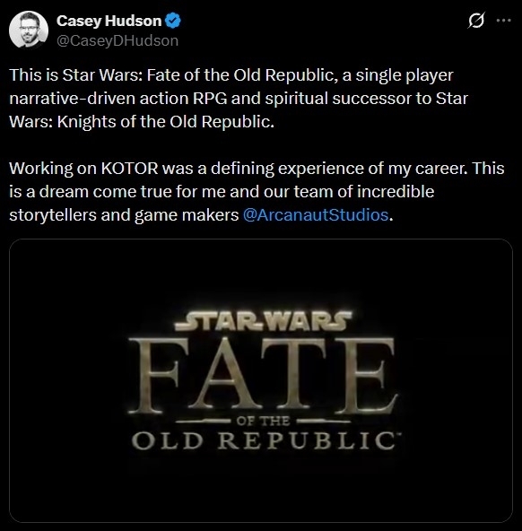 想必凯西得到了卢卡斯影业的支持,正紧急招募人员来组建Arcanaut工作室。他在社交平台上提到,《旧共和国命运》属于单机RPG类型,同时也是《旧共和国武士》的精神续作。