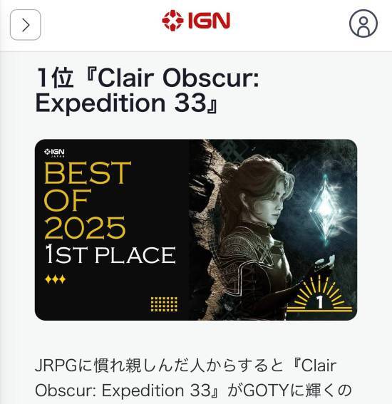 然而在昨天晚上,IGN日本却把《光与影:33号远征队》评选为他们自己的“年度最佳游戏”。