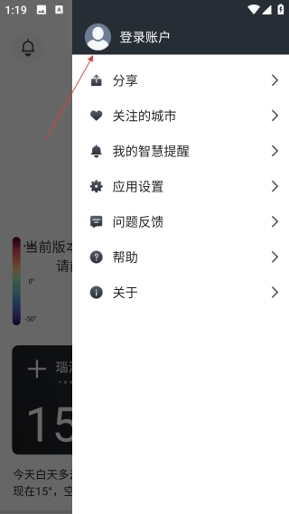 1、在天气界面,点击【右上角菜单按钮】,进入功能菜单界面。