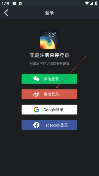 3、在登录选择界面,点击【微博登录】,进入微博登录界面。