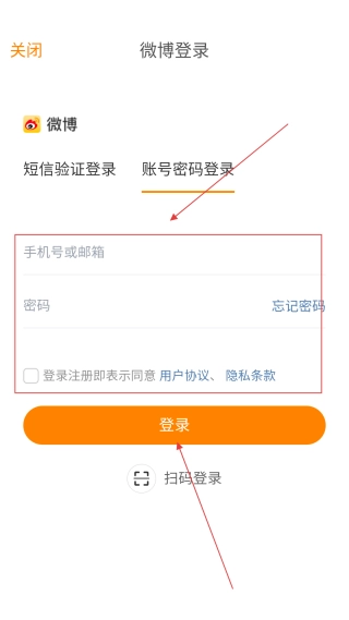 4、在微博登录界面【输入账号密码并勾选协议】后点击【登录】,即可完成登录操作。