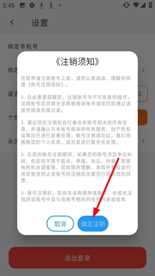 4、于《注销须知》弹窗内,点击【确定注销】按钮,便能申请永久注销账号。