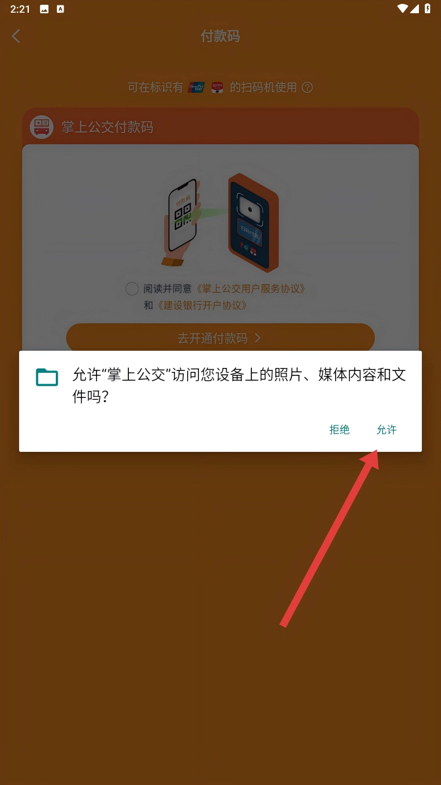 2、打开付款码页面后,若出现权限申请弹窗,点击【允许】按钮,给予应用相应的访问权限,如此方可成功开通付款码。