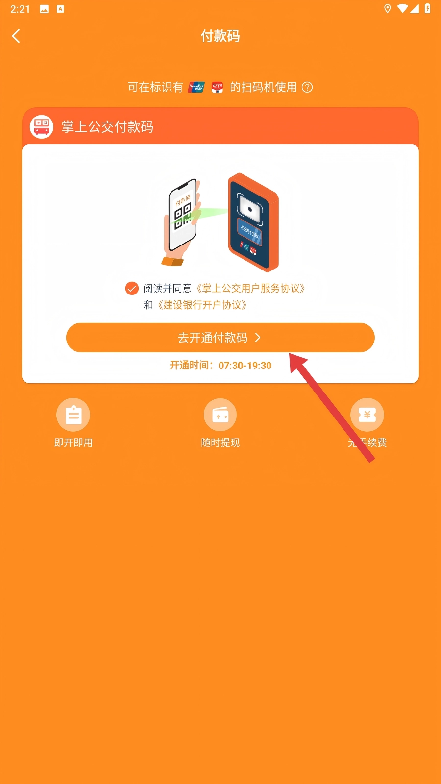 3、完成权限授予后,勾选相关协议并点击【去开通付款码】按钮,接着根据页面提示进行操作,即可继续推进扫码乘车功能的开通流程。