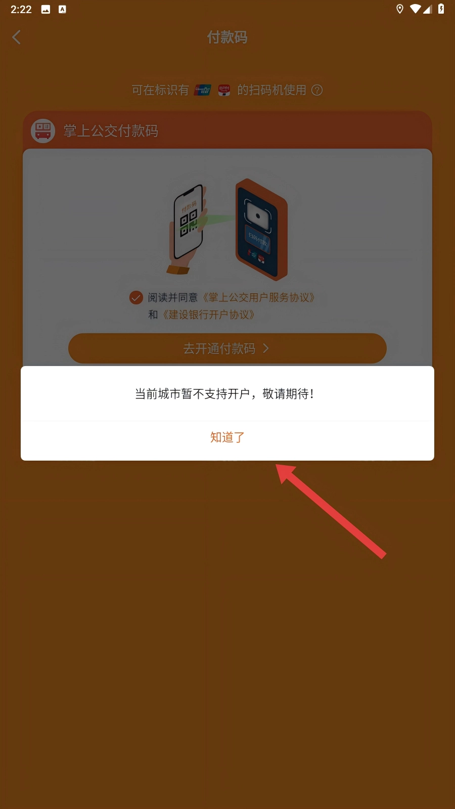 4、要是当前所在城市暂时还不支持开户,点击【知道了】就行啦,之后可以留意应用的更新情况,等支持该城市开户后,再去开通扫码乘车功能哦。
