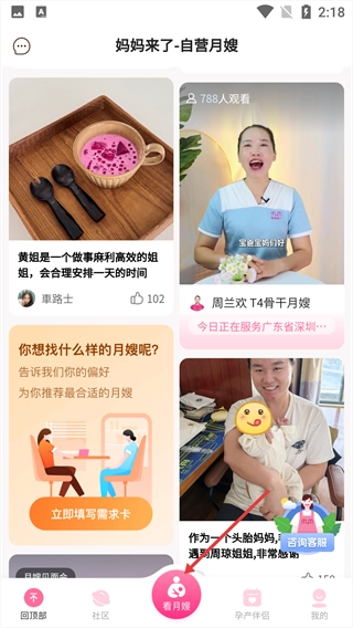 1、打开,点击底部【看月嫂】按钮。