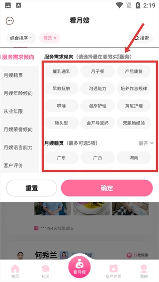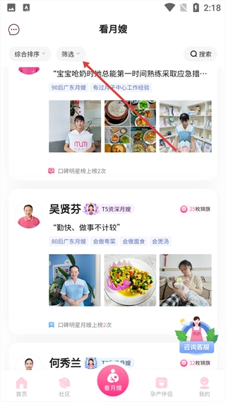 2、进入【看月嫂】页面后,点击上方【筛选】功能。