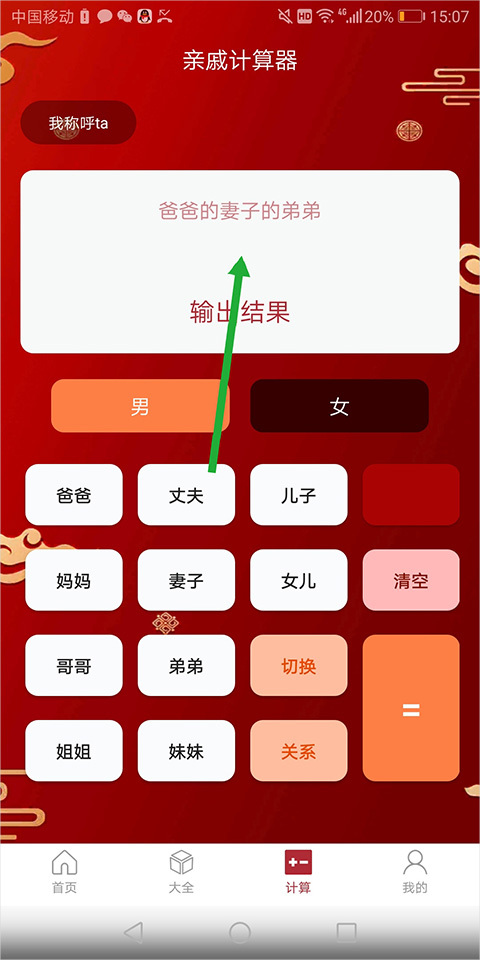 3、点击等号后,就能计算出对应的亲戚称呼。