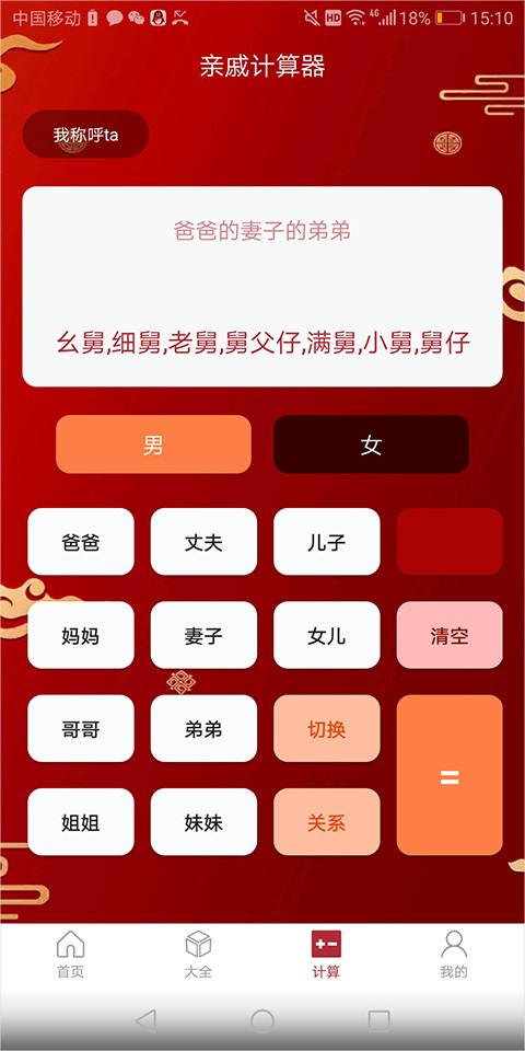 1、用户能够进入【计算】页面执行亲戚计算操作。第一步,在该页面以自身作为基准,去计算自己与其他亲戚间的复杂关系。