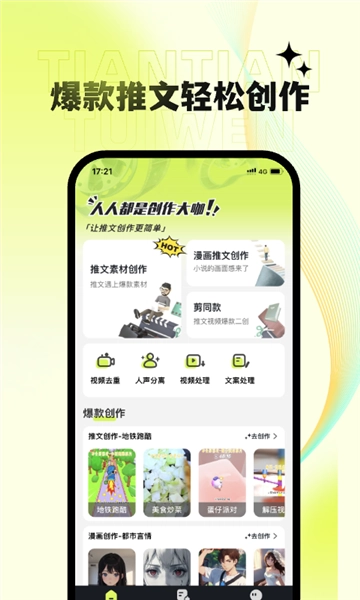 天天推文作为一款专为内容创作者与营销人员打造的小说推文创作工具,能为用户提供创作辅助,支持小说推文与短视频的创作流程。该软件拥有涵盖情感、职场、科技等全领域的海量热门素材库,且每日实时更新热门视频内容,用户可自由组合创新,以此打造出具有差异化的推文作品。此外,软件还具备根据关键词自动生成标题和正文的功能,有助于提升创作效率。