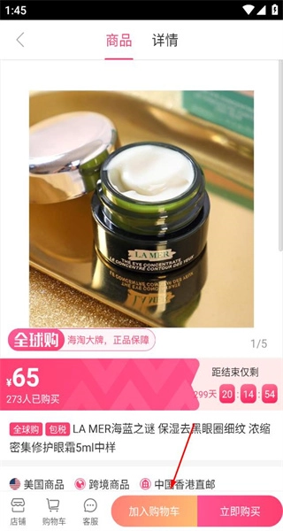 3、进入海蓝之谜眼霜的商品详情页,查看其价格与商品信息,了解购买情况后,继续浏览商品的相关内容。