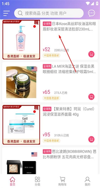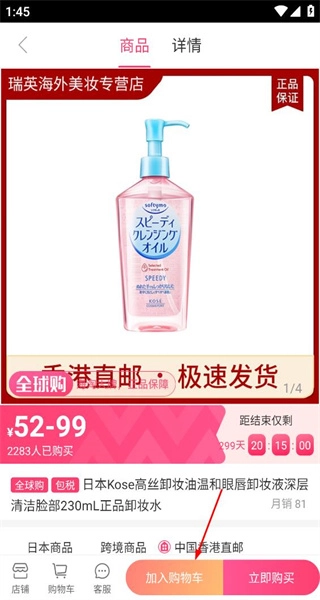 打开软件后,首页呈现出多款美妆商品,从中挑选日本高丝卸妆液这一商品,随后进入该商品的详情页面。