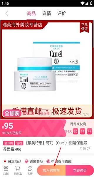 4、进入珂润面霜的商品详情页,查看其价格与月销量信息,了解发货方式,为后续的选购操作做好准备。