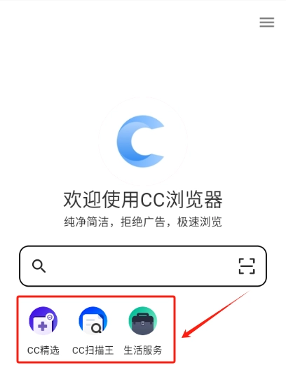 1. 启动CC浏览器后,您将进入主页界面,这里设有“cc精选”“cc扫描王”以及“生活服务”等板块。
