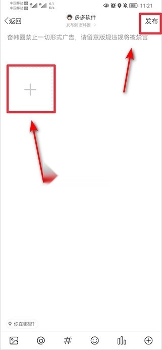 在编辑页面,您可以开始撰写内容。若想添加照片,只需点击加号图标(+),接着选择要上传的照片。完成内容编辑后,点击“发布”按钮,就能把您的信息分享给在韩华人社区。