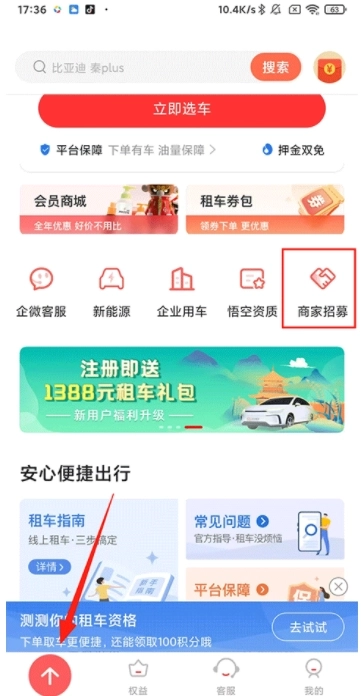 1、新用户可专享价值1388元的租车礼包,仅需几十元就能租到自己心仪的车辆。