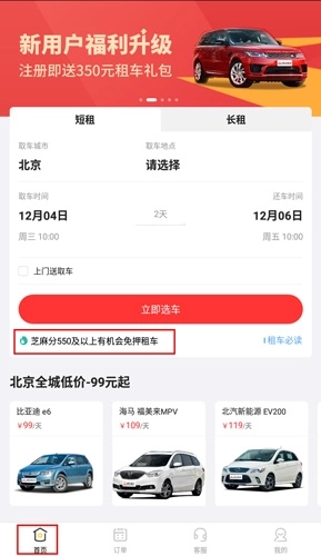 1、打开软件进入首页后,若想办理免押金租车业务,首要条件是你的芝麻信用分需达到550分及以上。