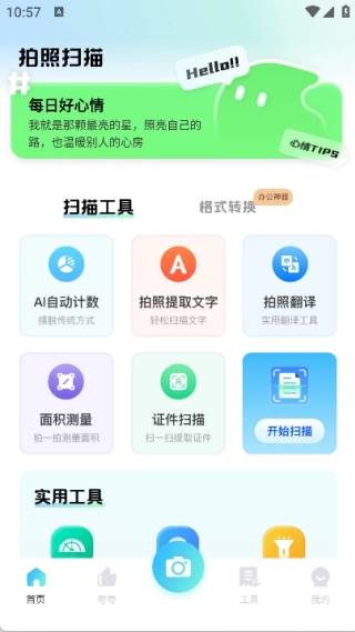 首页设有扫描工具、格式转换、实用工具三大版块,用户可依据自身需求从中选择使用。