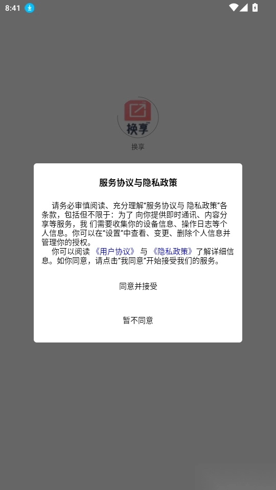 打开软件,阅读“服务协议与隐私政策”,然后点击“同意并接受”按钮进入。