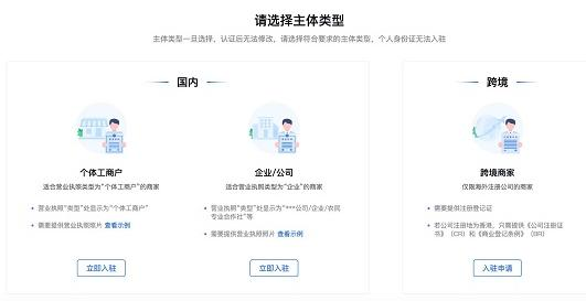-依据营业执照来选择入驻类型,包括企业或个体户。