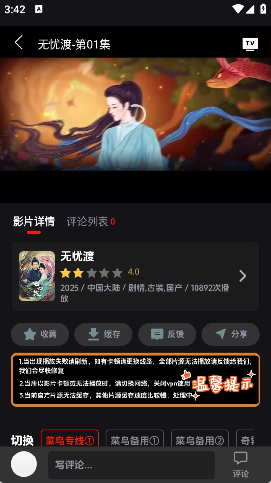 用户点击自己想看的影视资源进入播放界面后,可以选择具体集数,也能切换不同的播放源。