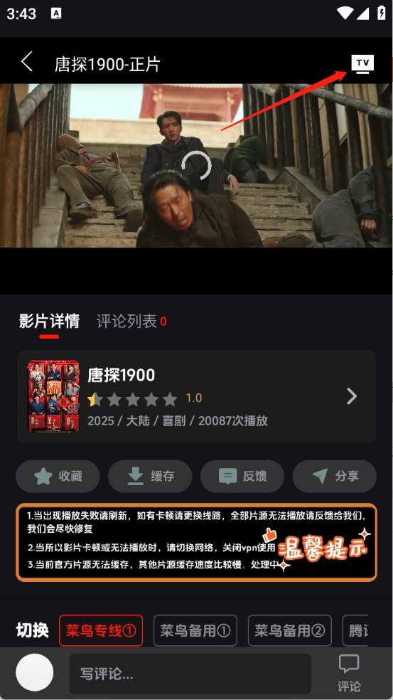 用户打开想要观看的影片进入播放页面后,点击右上角的“TV”按钮。