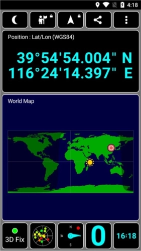 2、显示当前接收到的Gps卫星数量,信号强度,方位,显示你的Gps坐标,指南针功能。