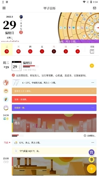 1、智能黄历:采用原创设计,用更雅致的形式展示每日宜忌与运势。