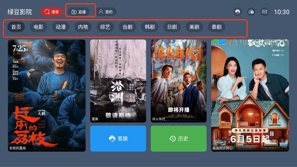 打开绿豆影院应用后,进入主界面,能看到直播、电视剧、电影、综艺、动漫、少儿、美剧、韩剧、热映等多个内容分类。界面顶部设有搜索栏,旁边还有个人中心的入口。
