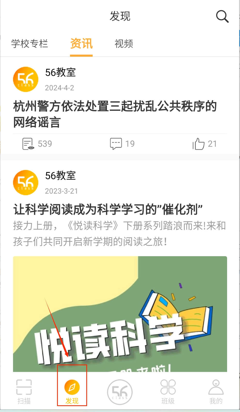 2、在“发现”页面浏览教育资讯,借助学校专栏筛选科学阅读等专题内容,同时也能查看其他用户的评论及点赞情况哟。