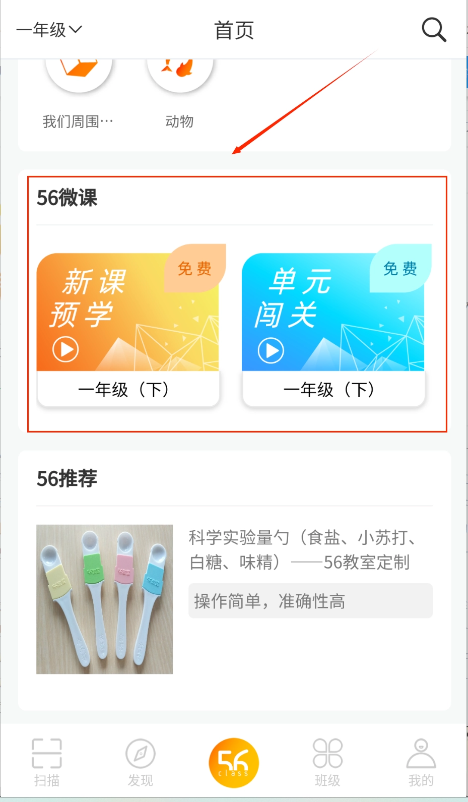 3、学习时,进入56微课板块,这里有新课预学、单元闯关等免费课程供你选择。在底部导航栏,能够随时切换扫描、班级等不同的功能模块。