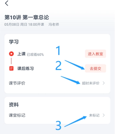 课程结束后,你可以在练习板块提交巩固作业,也能通过课节评价渠道反馈建议,相关标记内容可在页面下方的资料区查看。