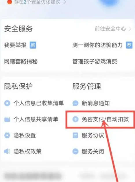进入用户保障相关的中心页面,找到并选择“无需密码即可支付/系统自动扣除款项”的相关功能设置选项。