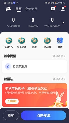 可以在主页查看当日详细的出车记录,还能切换不同的接单模式,实现一键接单。