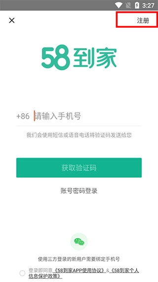 首先从当前平台的58到家服务入口进入并完成相关操作,之后需要用经过实名认证的手机号登录系统;若此前未注册过账号,可点击页面右上角的注册按钮完成账号注册流程。