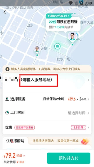 进入对应界面后,依次填写服务的具体地点、所需服务的类别以及希望服务人员上门的时段,待这些信息都确认无误后,点击预约并完成支付流程就可以了。