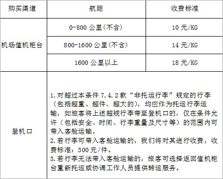 若您携带的行李在数量、尺寸或重量方面超出本条件7.4.2款关于“非托运行李”的规定,均须按托运行李办理运输。