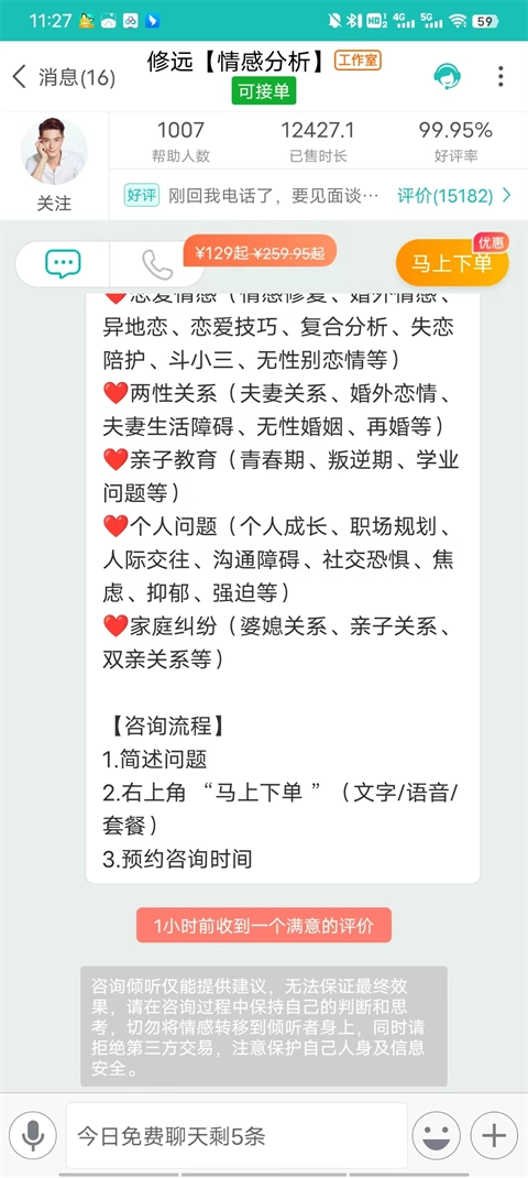 A:为了顺利进行咨询,建议您在下单前先确认倾听者是否处于可接单状态(该状态可在聊天界面最顶部查看),确认后再下单会更稳妥。要是您想进一步确保能及时得到回复,下单前可以先用免费文字条数询问倾听者是否方便提供服务,之后再决定是否下单。