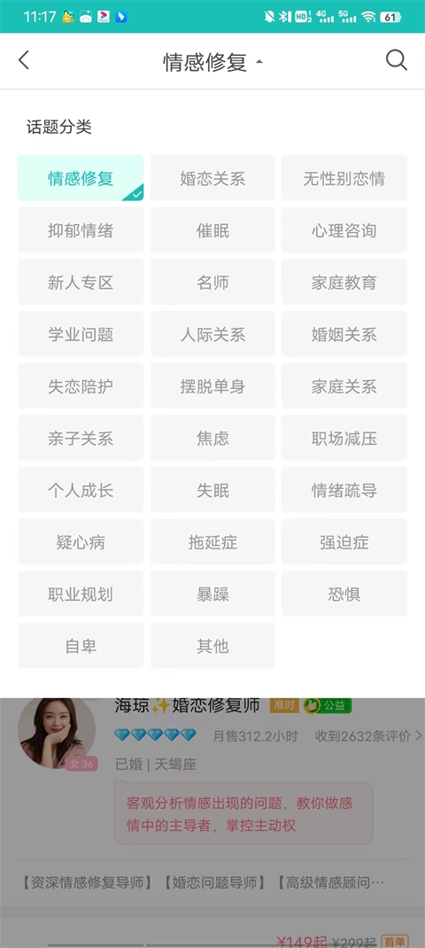 当然,你也可以点击情感咨询下方的小三角形,自行选择其他话题分类。