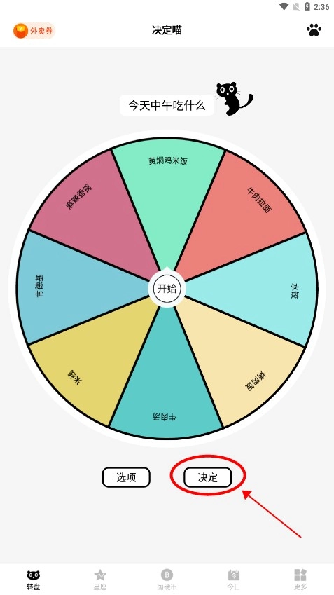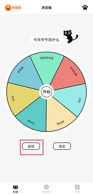 1、打开决定喵,在转盘界面中点击选项