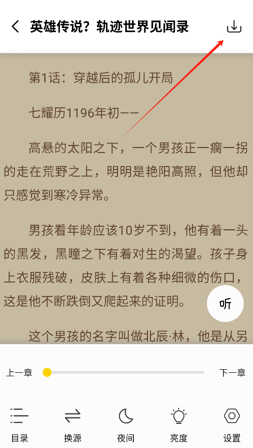 要开启缓存功能,可按以下步骤操作:在阅读界面点击屏幕中间区域,之后找到并点击屏幕右上角的【↓】图标。