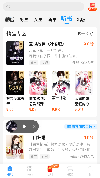 听书板块的操作步骤:先打开应用进入主界面,接着在首页搜索栏的下方找到并点击“听书”板块的入口。